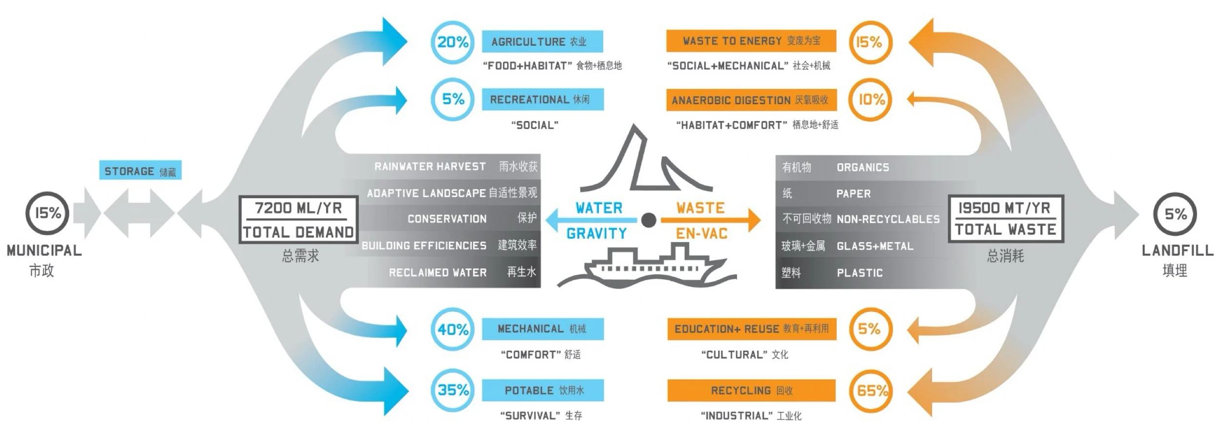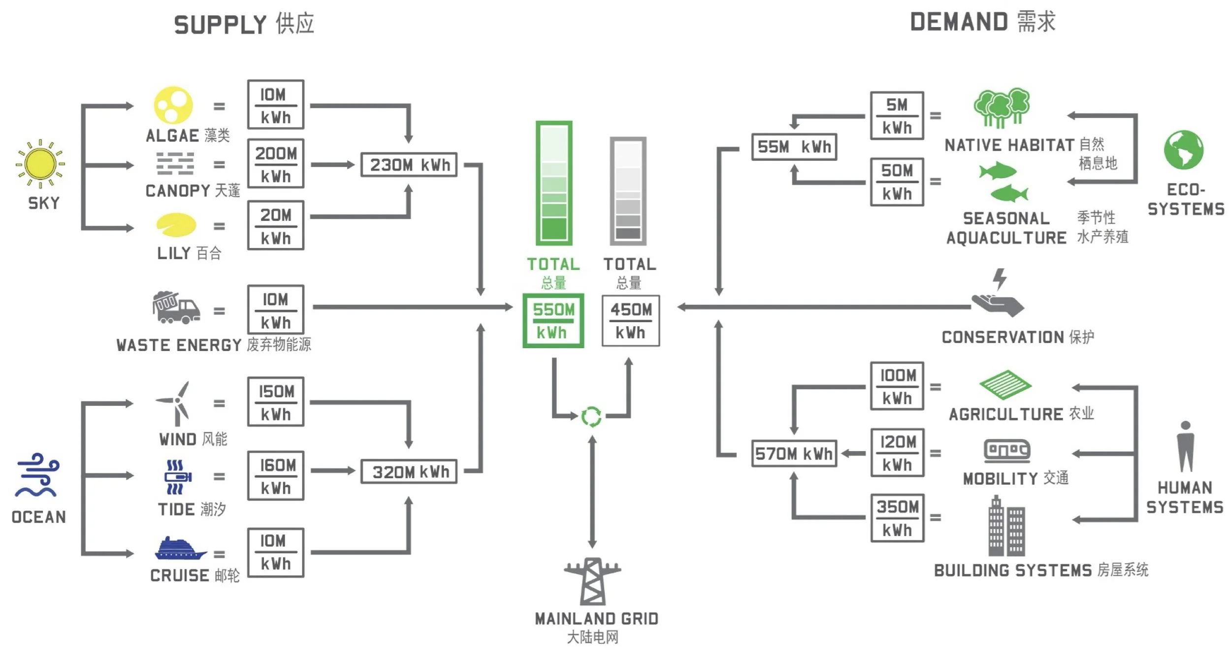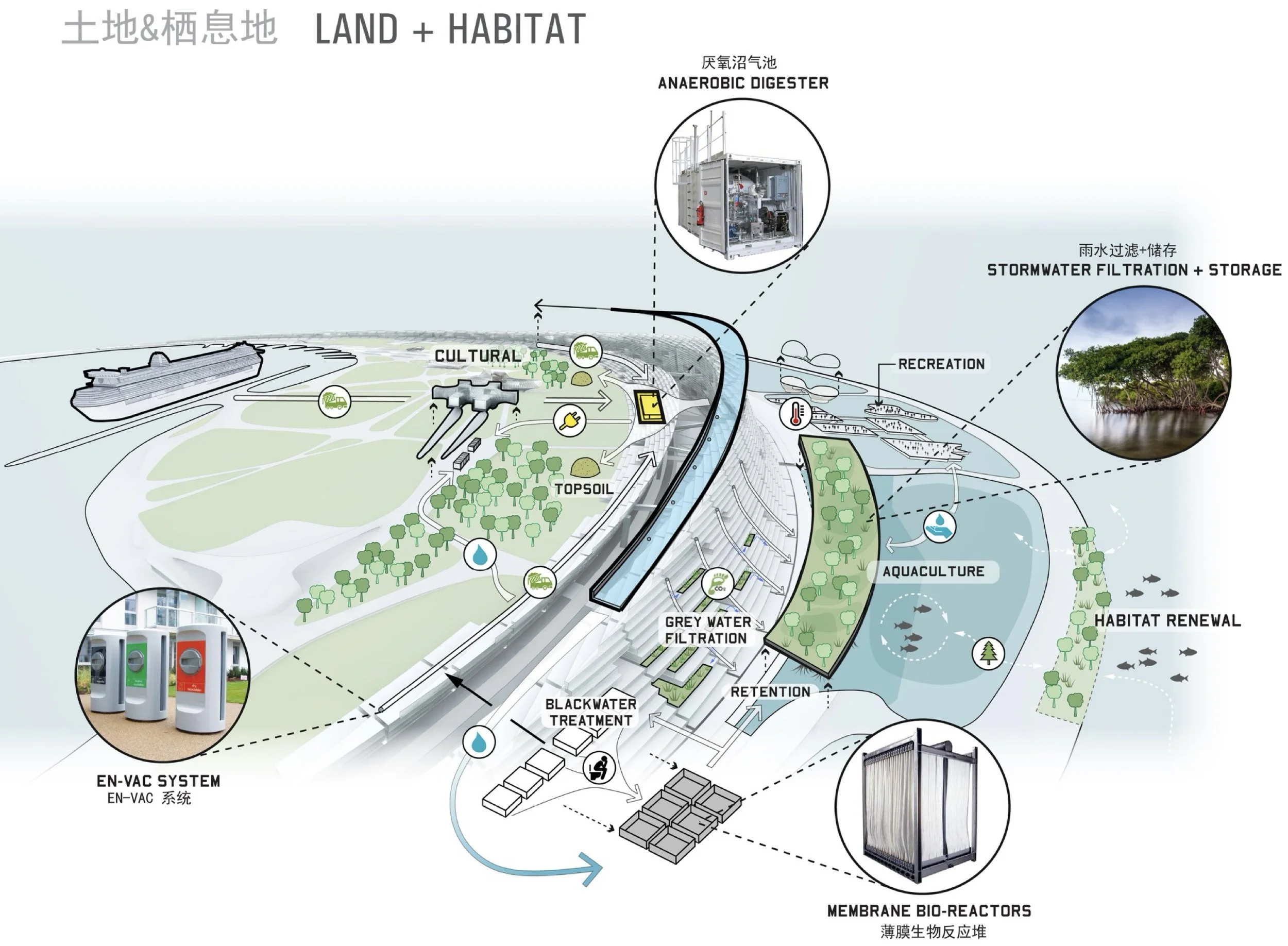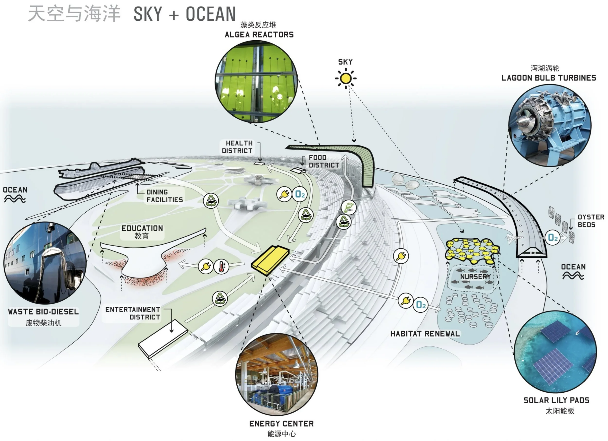 Algae reactors, tidal energy, floating solar, and closed-loop water systems work together to produce energy while regenerating habitat. The island operates as a continuous exchange between human and natural systems, where each sustains the other.