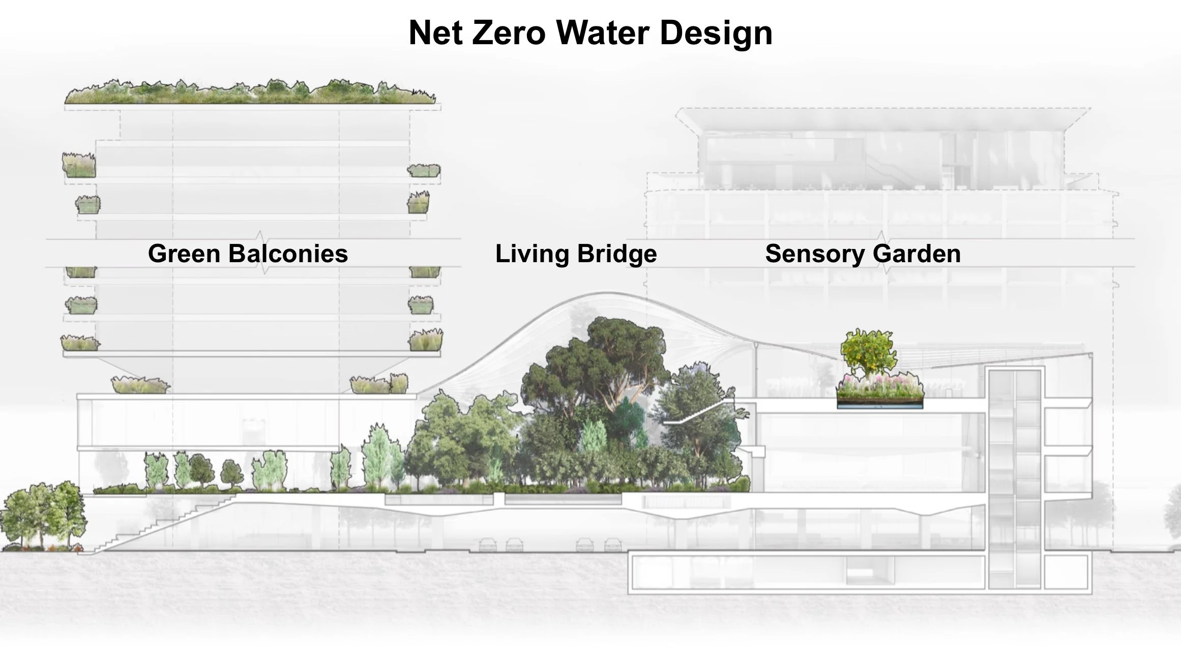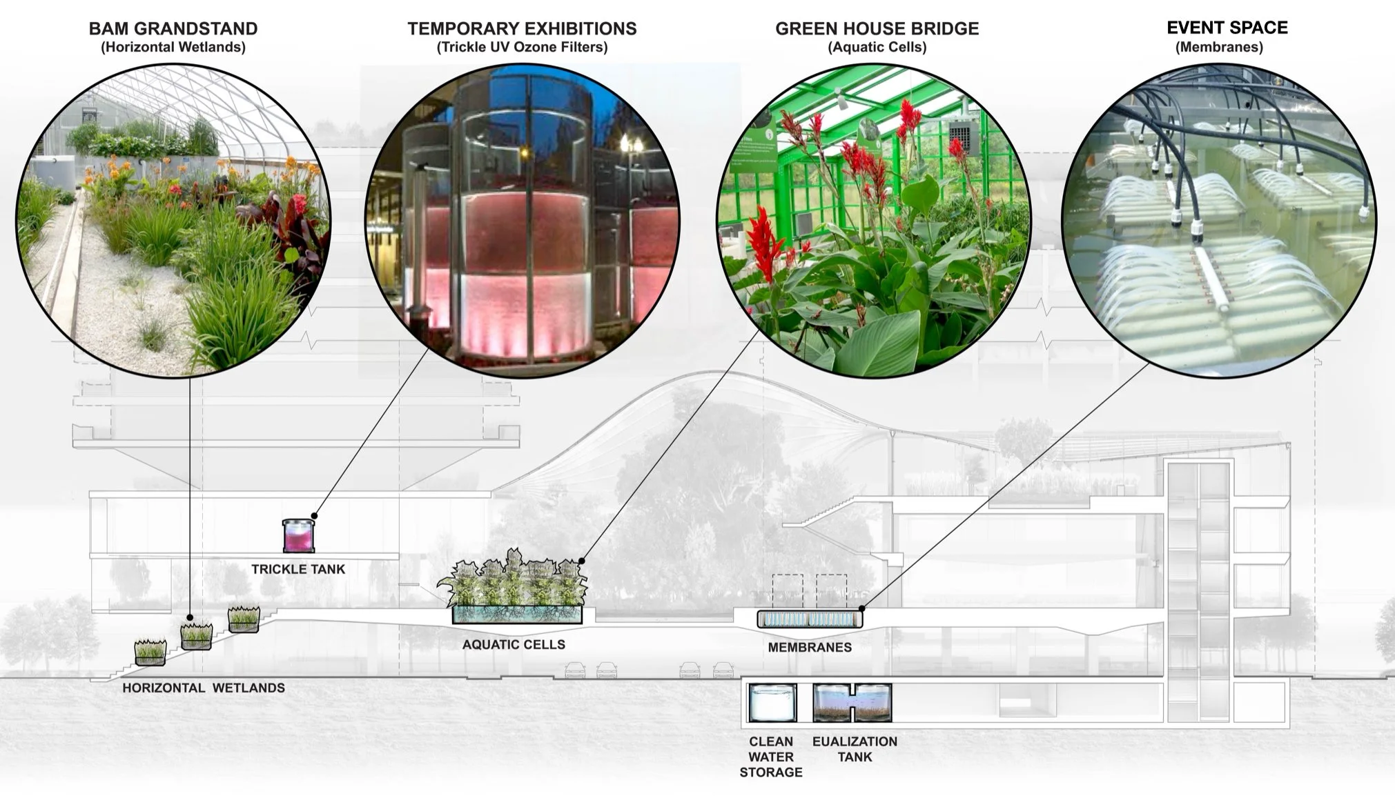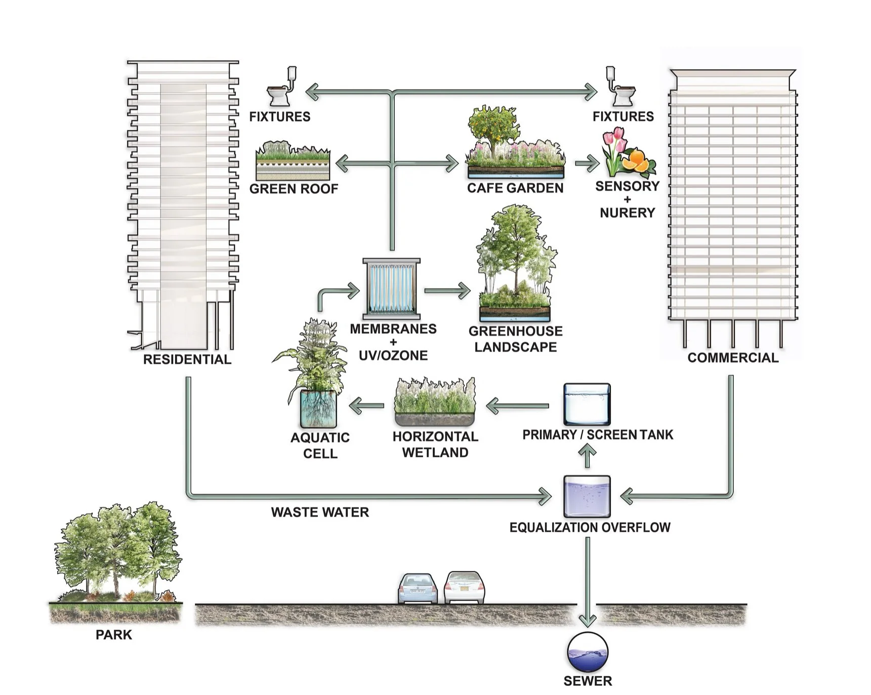 Wastewater from both towers flows into the bridge, where wetlands and membrane - designed by Natural Systems Utilities - bioreactors naturally filter 30,000 gallons a day. The clean water is reused for irrigation and building systems, reducing strain on the city’s sewers. At the same time, waste heat is captured to support a greenhouse, cultural spaces, and a wellness center within the bridge.