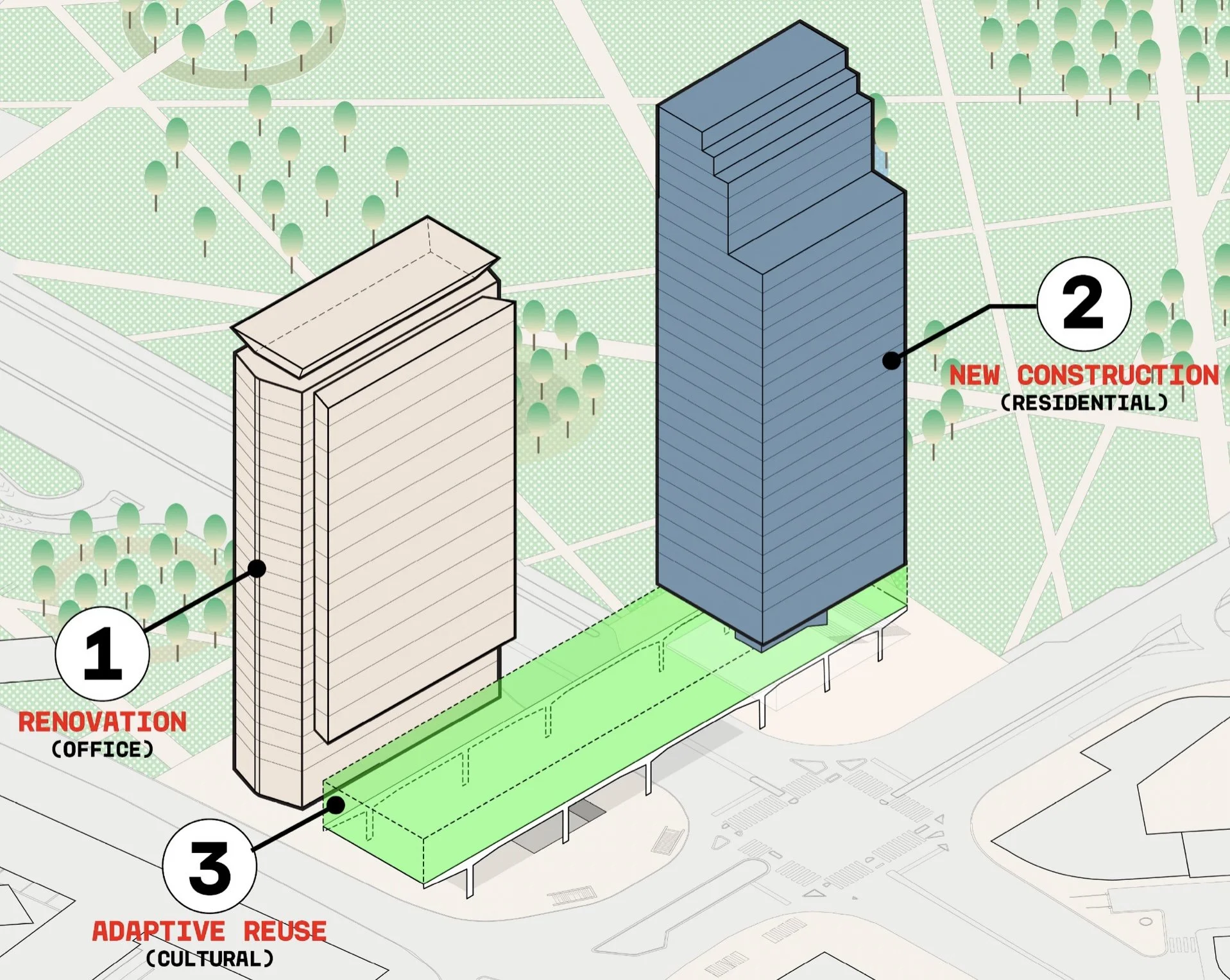 The Living Bridge transforms Milan’s Perrilino Tower and its adjacent office bridge into a self-sustaining urban ecosystem. Working with Stefano Boeri, we reimagine the bridge as a link between the commercial tower and his new residential building, powered by the exchange of their waste streams.