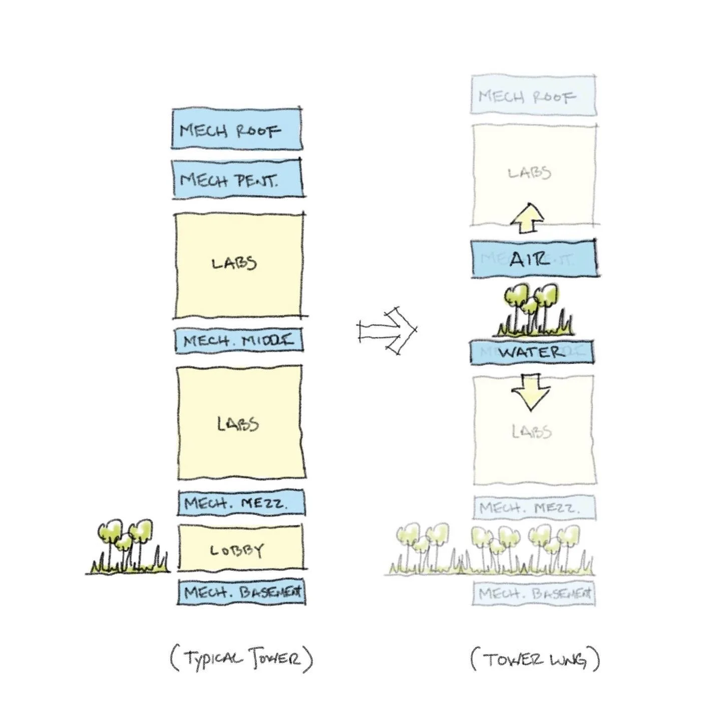 Inspired by the Life Sciences research of the campus community, the tower design integrates building, infrastructural, and ecological systems to create its own internal metabolism that increases the productivity of each system and improves the quality of life through mutually beneficial resource exchanges. The ‘Tower Lung’ design becomes the proud visual expression of the tower and communicates the optimism of the emerging research of a bio-tech future.